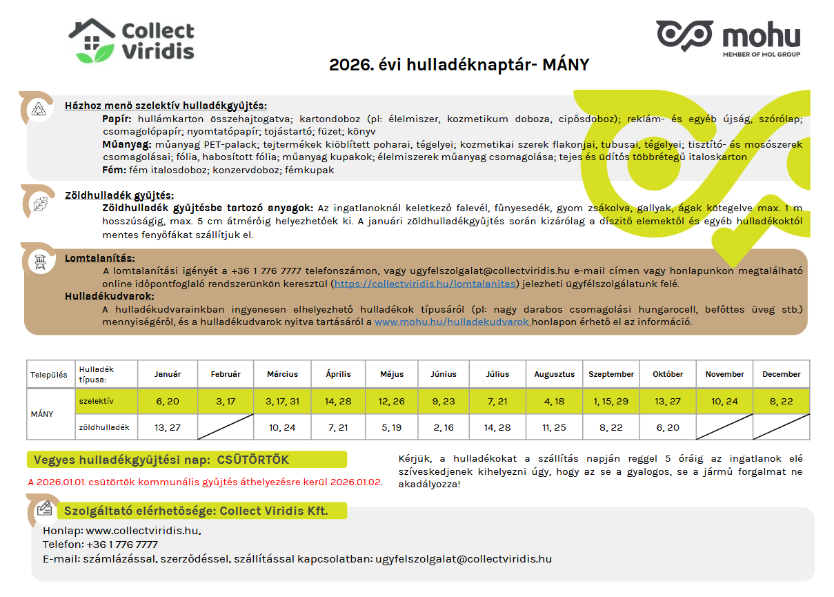 A MOHU MOL Zrt. és a területileg illetékes NHSZ Vértes Vidéke Nonprofit Kft döntése alapján tájékoztattak Bennünket, hogy Mányon, 2024 január 1-től a Collect Viridis Kft. fogja végezni a lakossági hulladék gyűjtését és elszállítását. A Collect Viridis Kft, Régió Koordinátori Közreműködőként látja el a feladatait.